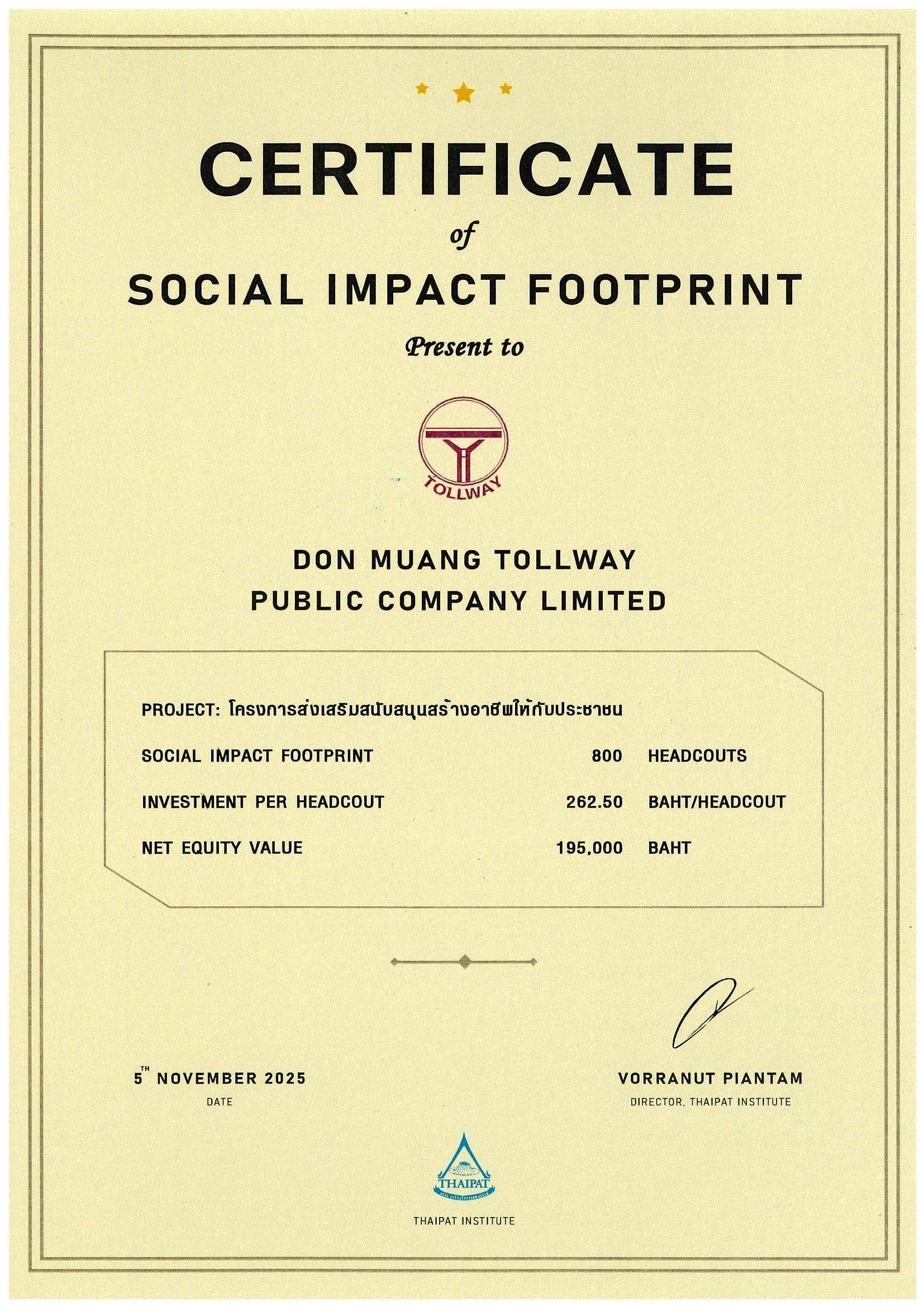 บริษัท ทางยกระดับดอนเมือง จำกัด (มหาชน) หรือ DMT ได้รับมอบใบประกาศนียบัตรรับรอง “โครงการ Tollway Better Way อบรมส่งเสริมสนับสนุนสร้างอาชีพให้กับประชาชนเขตหลักสี่ และเขตดอนเมือง” จากสถาบันไทยพัฒน์ โดยมี ดร.ศักดิ์ดา พรรณไวย กรรมการผู้จัดการบริษัทฯ เป็นผู้แทนรับมอบจาก อาจารย์วรณัฐ เพียรธรรม ผู้อำนวยการสถาบันไทยพัฒน์
