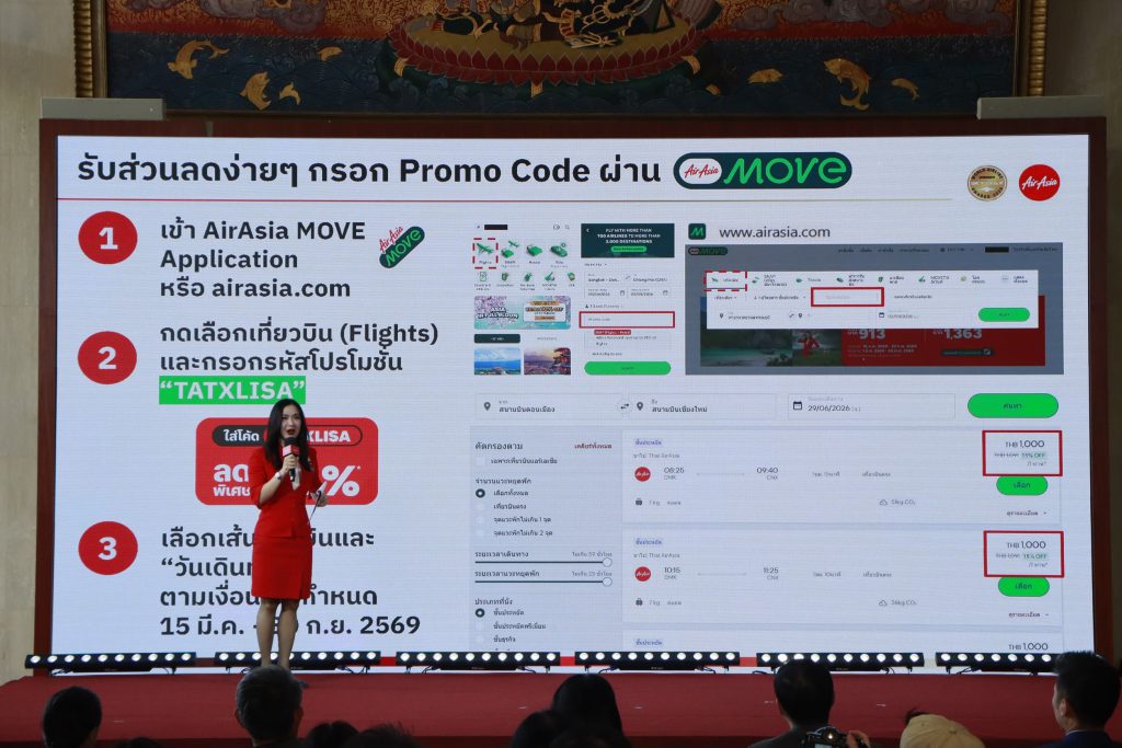 การท่องเที่ยวแห่งประเทศไทย (ททท.) จับมือ สายการบินไทยแอร์เอเชีย ต่อยอดแคมเปญแห่งปี “Feel all the Feelings เที่ยวเมืองไทย สัมผัสถึงทุกความรู้สึก” เปิดตัวโครงการ “FLY YOUR FEELINGS บินไปให้สุด..ทุกความรู้สึกทั่วไทย” มอบโปรโมชั่นพิเศษ ส่วนลดสูงสุดค่าบัตรโดยสาร 15% สำหรับ 8 เส้นทางบินตามรอย Amazing Thailand Ambassador “ลิซ่า ลลิษา มโนบาล” และกิจกรรมลุ้นตั๋วเครื่องบินเที่ยวไทยฟรีตลอดปี ชวนนักท่องเที่ยวบินตามรอยลิซ่า ด้วยเครือข่ายบินภายในประเทศ 42 เส้นทาง ครอบคลุม 25 จุดหมายทั่วทุกภูมิภาค ผู้ที่สนใจสามารถสำรองที่นั่งผ่านแอปพลิเคชัน AirAsia MOVE ได้ตั้งแต่วันที่ 1 มีนาคม –31 พฤษภาคม 2569 และเดินทางได้ระหว่างวันที่ 15 มีนาคม – 30 กันยายน 2569