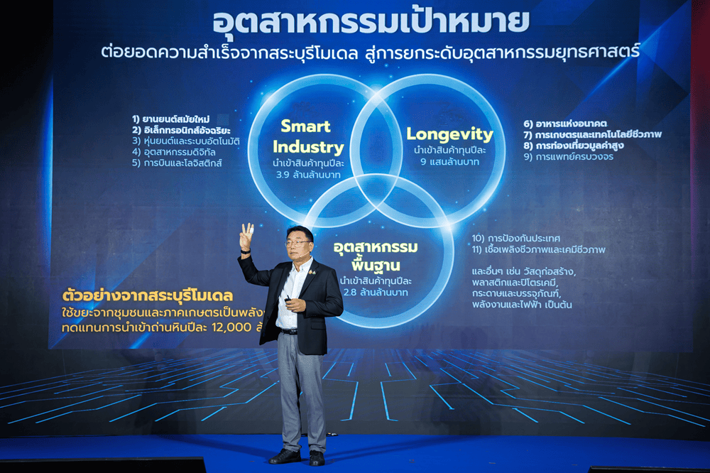 ทั้งนี้ ยุทธศาสตร์ขับเคลื่อนอุตสาหกรรมไทยก้าวกระโดดสู่ SMART INDUSTRY คือ 5 SMART + ร่วมลงมือทำ 1. Smart Industry: เพิ่มประสิทธิภาพการผลิต 2 เท่า 2. Smart Market: สร้างตลาดในประเทศ และขยายตลาดต่างประเทศ 3. Smart Funding: สนับสนุนเงินทุน SMEs เพื่อการเปลี่ยนผ่าน 4. Smart & Green Infrastructure: ส่งเสริมลดต้นทุนพลังงานและโลจิสติกส์ 5. Smart Government: ผลักดันราชการเร็ว สะดวก โปร่งใส พลัสด้วย PPPP Model (Public Private People Partnership) ความร่วมมือภาครัฐ เอกชน และประชาสังคม ร่วมทำบนจุดแข็งของตัวเอง ยกระดับ “สระบุรีโมเดล” ที่ประสบความสำเร็จ เป็น Thailand Model เพื่อขยายผลวิธีการทำงานด้วยความร่วมมือ โดยภาครัฐมีแนวทาง เอกชนขับเคลื่อน และประชาชนได้ประโยชน์