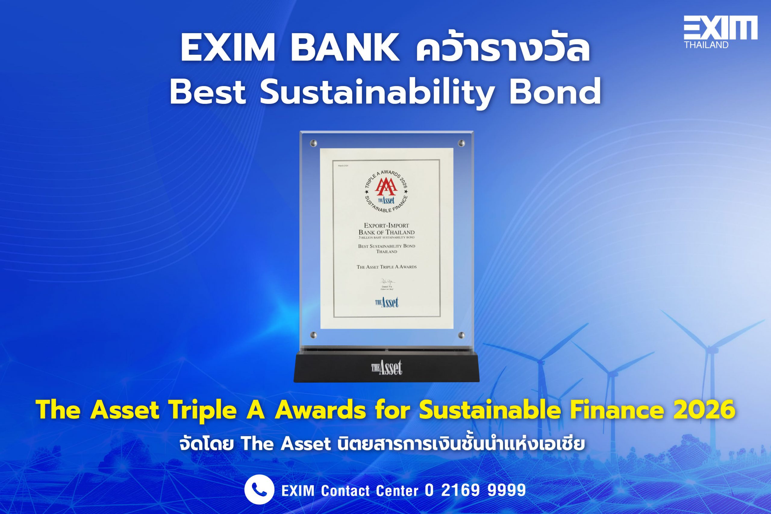 นางสาวดรัสวันต์ ชูวงษ์ รองกรรมการผู้จัดการ ธนาคารเพื่อการส่งออกและนำเข้าแห่งประเทศไทย (EXIM BANK) รับมอบรางวัล Best Sustainability Bond จากเวที The Asset Triple A Awards for Sustainable Finance 2026 จัดโดยนิตยสาร The Asset นิตยสารการเงินชั้นนำแห่งเอเชีย จากความสำเร็จของ EXIM BANK ในการเสนอขายพันธบัตรเพื่อความยั่งยืน (Sustainability Bond) อายุ 3 ปี มูลค่า 3,000 ล้านบาท ภายใต้กรอบการระดมทุนเพื่อความยั่งยืน (Sustainable Finance Framework) เมื่อเดือนมิถุนายน 2568 เพื่อระดมทุนไปใช้สนับสนุนสินเชื่อที่เป็นมิตรต่อสิ่งแวดล้อม และสินเชื่อเพื่อสนับสนุนผู้ประกอบการ SMEs ในการขับเคลื่อนเศรษฐกิจ สังคม และชุมชนอย่างยั่งยืน สอดคล้องกับวิสัยทัศน์ของประเทศไทยในการขับเคลื่อนการพัฒนาอย่างยั่งยืนทั้งมิติเศรษฐกิจ สังคม และสิ่งแวดล้อม ณ เขตบริหารพิเศษฮ่องกงแห่งสาธารณรัฐประชาชนจีน เมื่อวันที่ 31 มีนาคม 2569