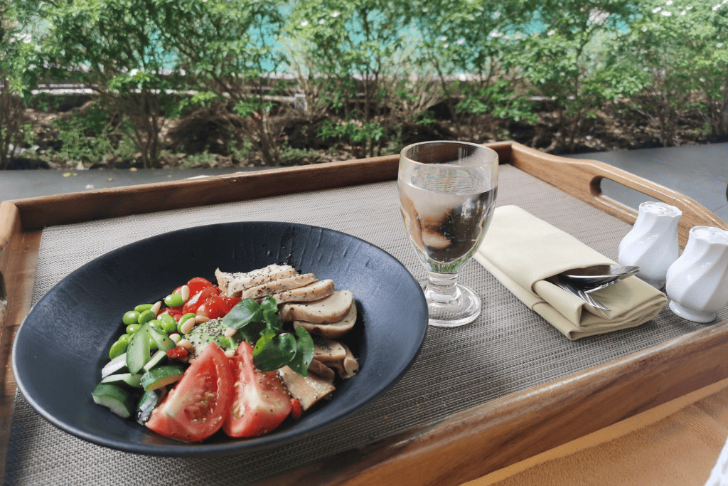 และที่พิเศษสุดๆ จนเราอยากมาบอกต่อคือความชิลของการได้ทานมื้อกลางวันริมสระว่ายน้ำ (Poolside Lunch) ซึ่งเราสามารถสั่งตรงจากห้องอาหาร City Terrace มาเสิร์ฟให้ทานถึงที่ได้เลย โดยเมนูที่เราเลือกสั่งมาเติมความสดชื่นคือ “สลัด” ชามโตหน้าตาน่าทาน ที่อัดแน่นไปด้วยผักสดกรอบและวัตถุดิบคุณภาพดี ทานง่าย สบายท้อง เข้ากับบรรยากาศการพักผ่อนเอนกายรับลมริมสระเป็นอย่างดี ถือเป็นอีกหนึ่งประสบการณ์ที่ทำให้การ Staycation ครั้งนี้สมบูรณ์แบบมากยิ่งขึ้น