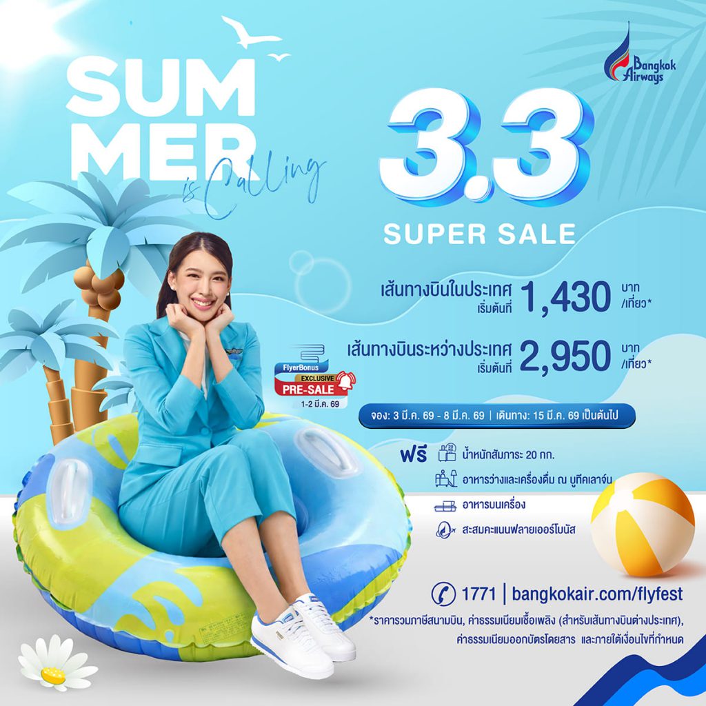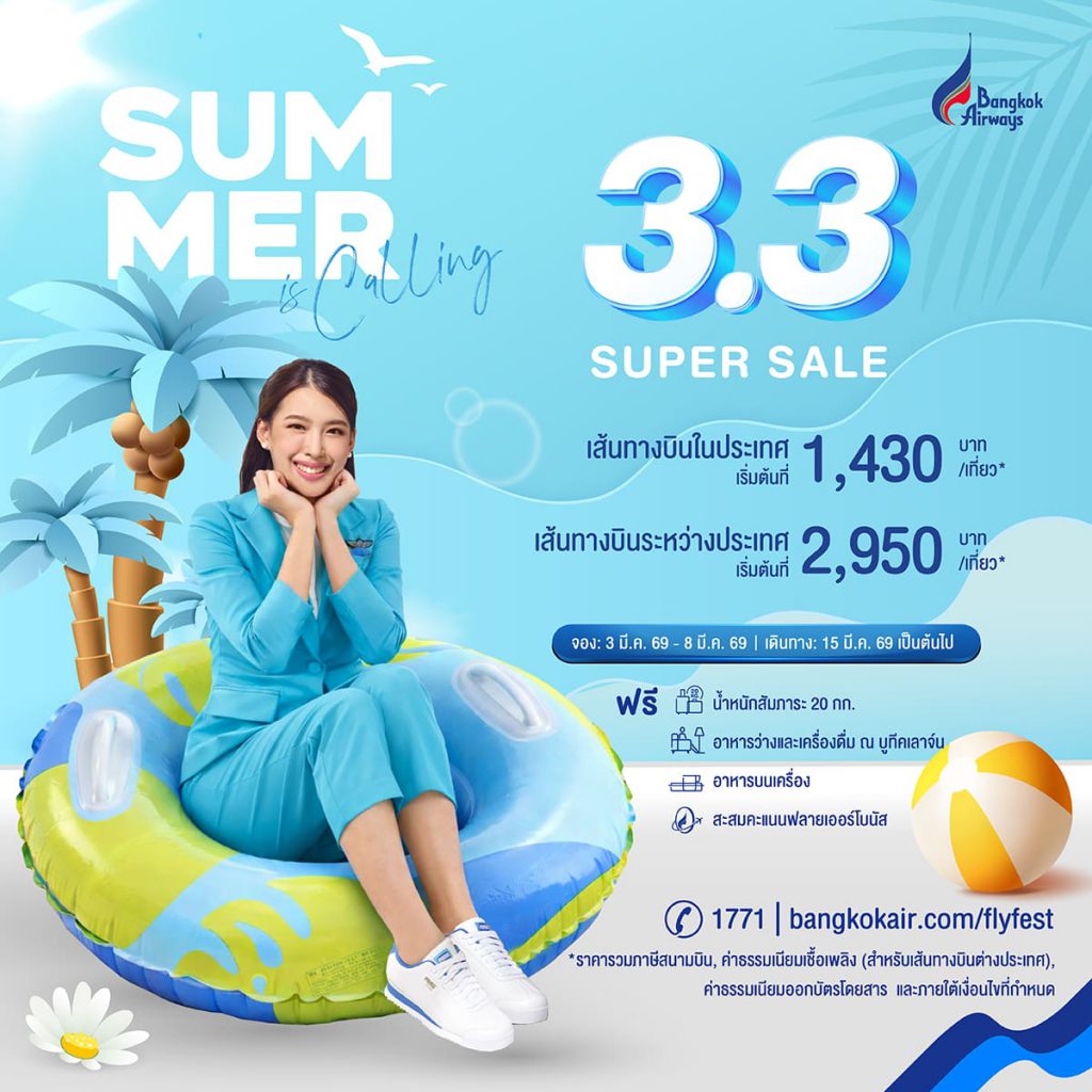บริษัท การบินกรุงเทพ จำกัด (มหาชน) หรือสายการบินบางกอกแอร์เวย์ส ต้อนรับซัมเมอร์ด้วยดีลฮอตสุดพิเศษ “3.3 Super Sale” โปรโมชันบัตรโดยสารราคาสุดคุ้มสำหรับนักเดินทางที่กำลังวางแผนท่องเที่ยวพักผ่อนช่วงซัมเมอร์ ครอบคลุมเส้นทางยอดนิยมทั้งภายในประเทศและระหว่างประเทศ เส้นทางบินภายในประเทศเริ่มต้นเพียง 1,430 บาท/เที่ยว* และเส้นทางบินระหว่างประเทศเริ่มต้นที่ 2,950 บาท/เที่ยว* เปิดให้สำรองที่นั่งผ่านเว็บไซต์ www.bangkokair.com/flyfest ระหว่างวันที่ 3 – 8 มีนาคม 2569 และเดินทางได้ตั้งแต่วันที่ 15 มีนาคม 2569 เป็นต้นไป
